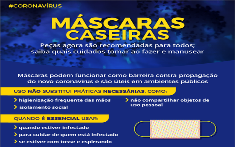 Os cidadãos de todo Estado poderão utilizar máscaras caseiras, confeccionadas com tecido, para atender à nova recomendação do Estado. A utilização da proteção facial, associada à orientação de isolamento social, tem objetivo de reduzir os índices de contaminação entre a população.