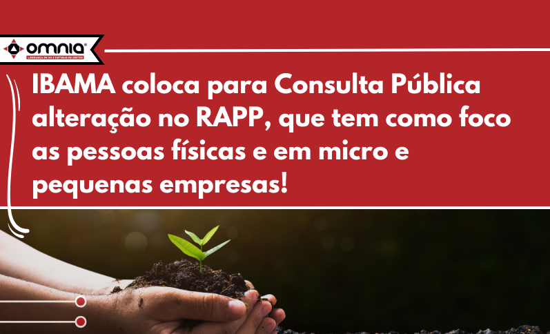 Foi publicada no DOU em 25/04/2023, a Portaria IBAMA nº 98, que submete a Consulta Pública, pelo prazo de 30 dias, a contar de da data de sua publicação, a proposta de Instrução Normativa de alteração da Instrução Normativa IBAMA nº 22, de 22/12/2021, que regulamenta o Relatório Anual de Atividades Potencialmente Poluidoras e Utilizadoras de Recursos Ambientais (RAPP).
