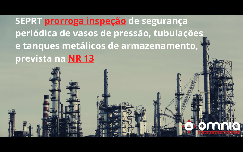 Em virtude do estado de calamidade pública reconhecido pelo Decreto Legislativo nº 6, de 20 de março de 2020, e da emergência de saúde pública de importância internacional decorrente do coronavírus (covid-19), de que trata a Lei nº 13979, de 6 de fevereiro de 2020, a Secretária Especial de Previdência e Trabalho do Ministério da Economia – SEPRT, publicou a Portaria SEPRT Nº 15797 DE 02/07/2020, que posterga em até seis meses o prazo previsto para a inspeção de segurança periódica de vaso sob pressão, tubulação e tanque metálico de armazenamento, estipulada na Norma Regulamentadora nº 13.