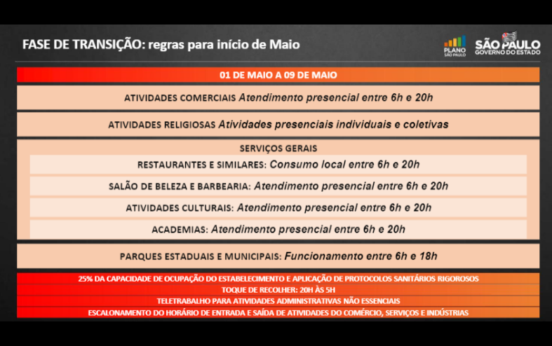 O Governador João Doria anunciou nesta quarta-feira (28) a prorrogação da fase de transição do Plano São Paulo para todo o estado por mais uma semana, até o dia 9 de maio. Com o recuo gradual de indicadores de casos, internações e mortes por COVID-19, o Estado fixou horário estendido das 6h às 20h para atendimento presencial limitado a 25% de capacidade em comércios e serviços não essenciais.